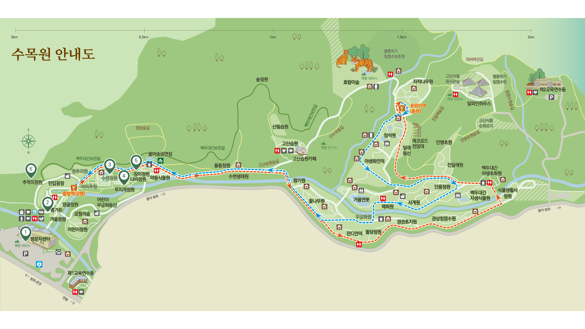 유모차 · 노약자 · 이용객, 아름다운 정원을 둘러볼 수 있는 코스 ※ 숲길의 경우 높은 경사 및 계단 등으로 유모차 · 노약자 이동에 어려움이 있으며 일부구간 경사 및 비포장 구간이 있으므로 유의하시기 바랍니다.