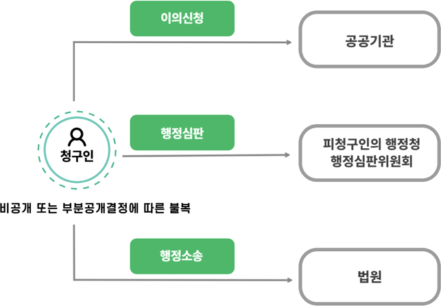 청구인이 정보공개와 관련한 공공기관의 결정에 대하여 불복이 있는 때에는 이의신청 · 행정심판절차를 거치지 아니하고 행정소송법이 정하는 바에 따라 행정소송을 제기할 수 있음